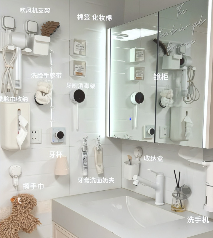 最最重要的就是卫生间的镜柜,这里的空间一定要预留出来,通常这里可以容纳很多的东西,经常用的清洁剂、化妆品、剃须刀、吹风机、洗脸巾等等,都能放入到里面,彻底释放台面的空间,让卫生间变得干干净净的。